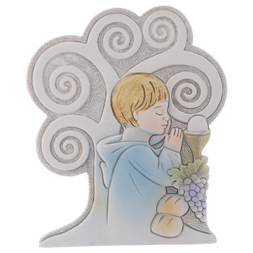 Lembrancinha Árvore Comunhão Menino 11 cm. Lembrancinha religiosa em pó de mármore com símbolos da Comunhão em relevo e detalhes corados.Adorno adequado por Primeira Comunhão dum menino.