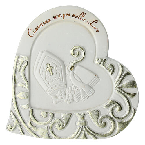 Lembrancinha coração mitra báculo. Lembrancinha de resina branca com elegantes detalhes em espiral dourados.