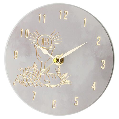 Lembrancinha para Primeira Comunhão em formato de relógio redondo, com decoração representando cálice, monograma IHS, espiga de trigo e cachos de uva.