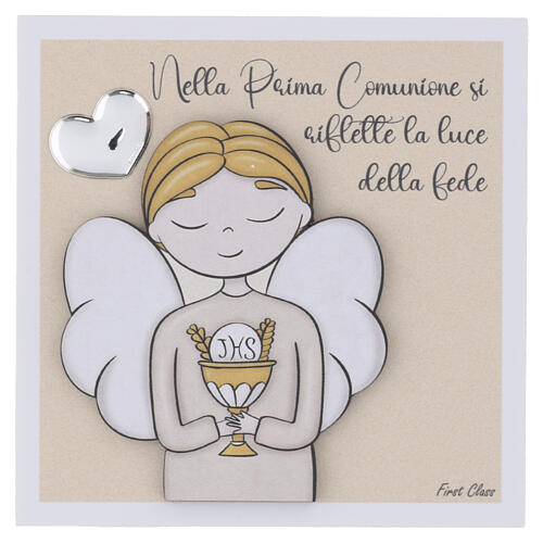 Placa 15x15 cm anjo com coração para Primeira Comunhão menino.