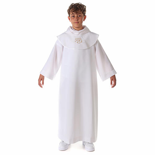 Alva Primeira Comunhão. Túnica infantil unisex para Primeira Comunhão com capuz, inteiramente confeccionada na Itália com materiais de origem italiana.